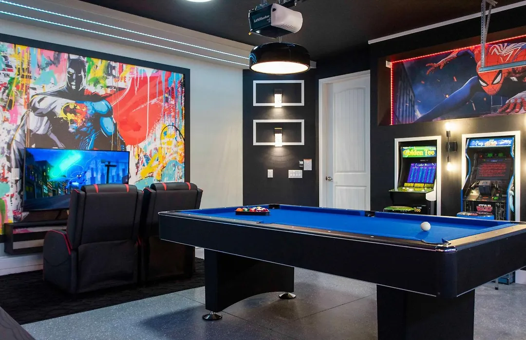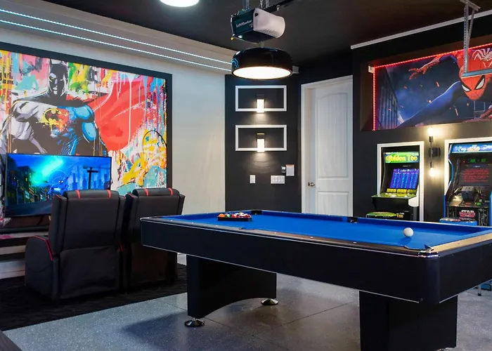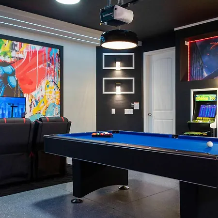 De 6-slaapkamer Family Escape With Private Pool Themed Rooms Orlando villa is gesitueerd op afstand van 3 km tot het Windsor Hills Resort en biedt toegang tot bezienswaardigheden in de omgeving. Dit vakantiehuis ligt in de Celebration wijk van Orlando en biedt mogelijkheden om te biljart in de omgeving.